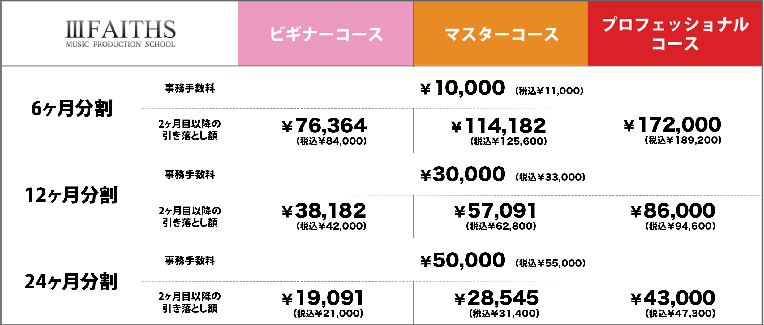 多くの専門学校では、音楽理論やキーボード演習など、細分化されたカリキュラムを用意するケースが多いため、数百万円という学費が発生します。私達のレッスンは、"ElectronicMusicをスピーディーに制作する"という1つの目的に特化したレッスン料金を実現しています。また世界水準のエンジニアとのコネクションを実現し、最先端の音楽制作情報を共有する今までの日本に無いスタイルの音楽制作スクールと言っても過言ではありません。