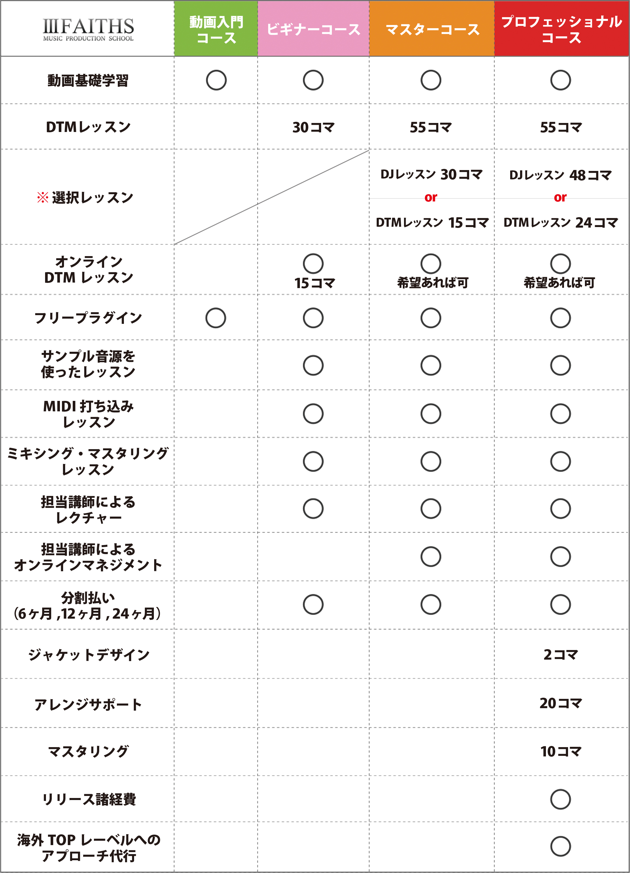 多くの専門学校では、音楽理論やキーボード演習など、細分化されたカリキュラムを用意するケースが多いため、数百万円という学費が発生します。私達のレッスンは、"ElectronicMusicをスピーディーに制作する"という1つの目的に特化したレッスン料金を実現しています。また世界水準のエンジニアとのコネクションを実現し、最先端の音楽制作情報を共有する今までの日本に無いスタイルの音楽制作スクールと言っても過言ではありません。